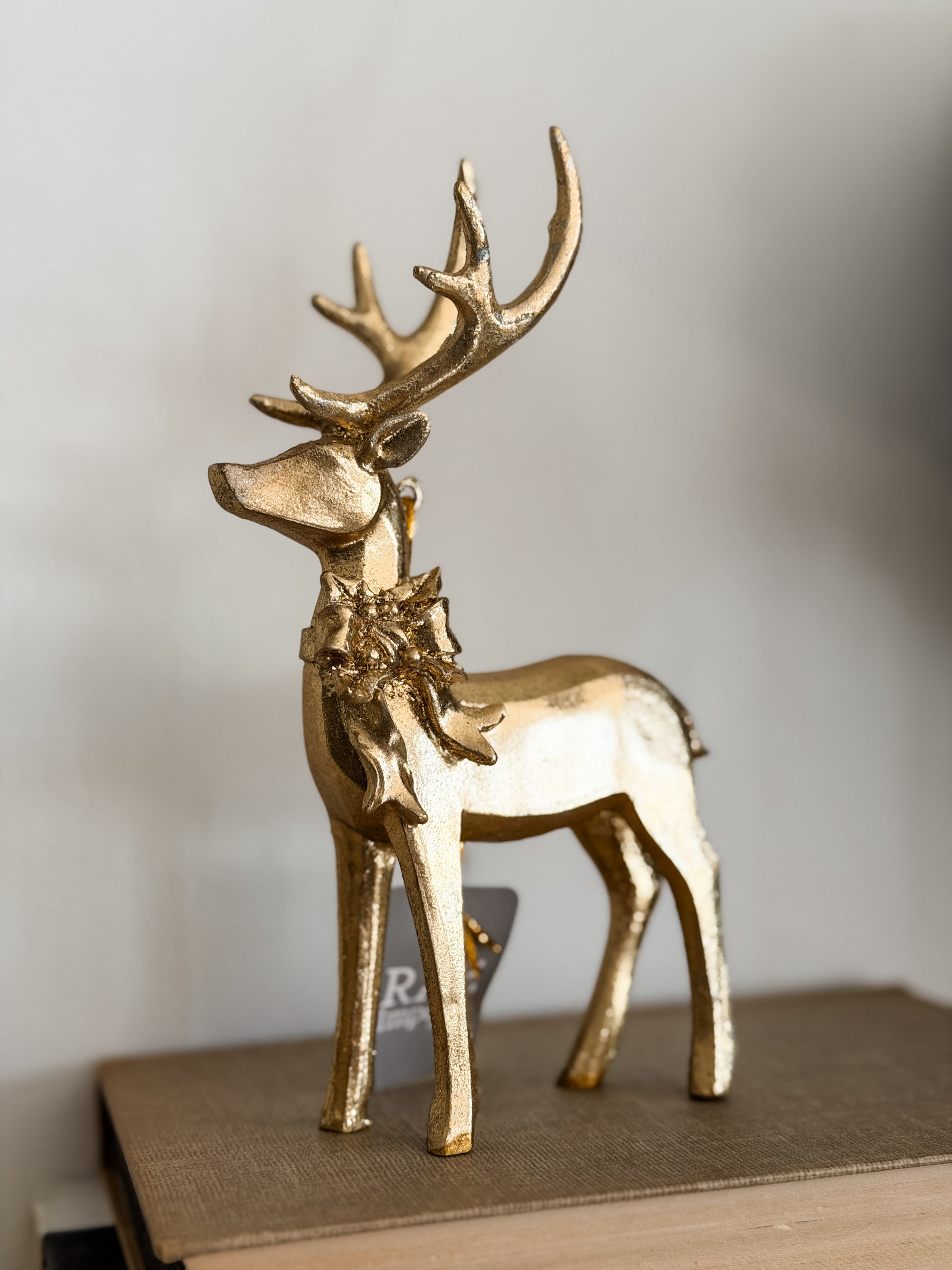 This elegantly crafted deer features a soft gold finish and is versatile enough to be displayed on a table or hung using the attached loop.