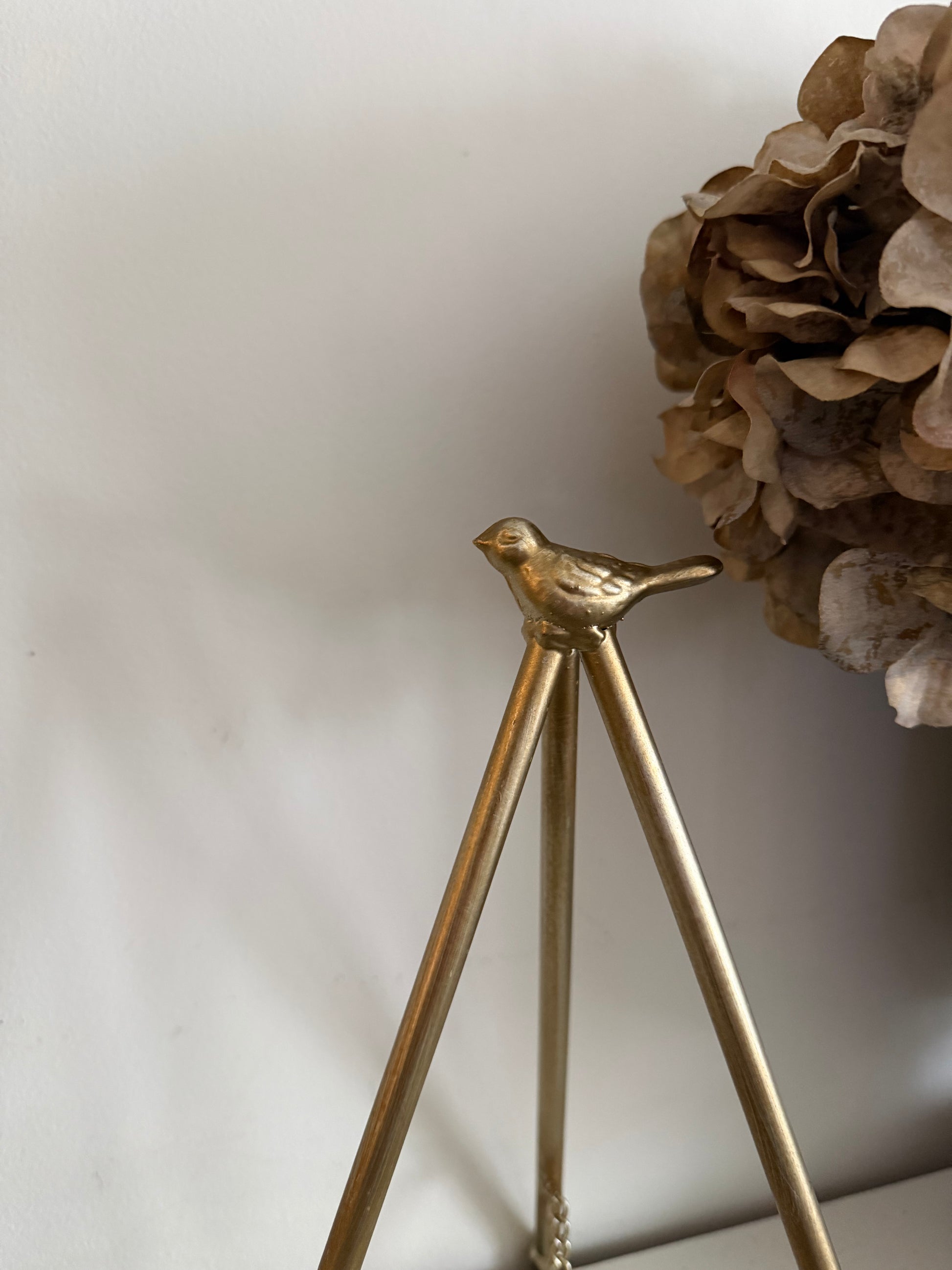 Display your most treasured seasonal artwork with this elegant iron bird-shaped easel, designed to add a refined decorative accent to any tabletop setting.