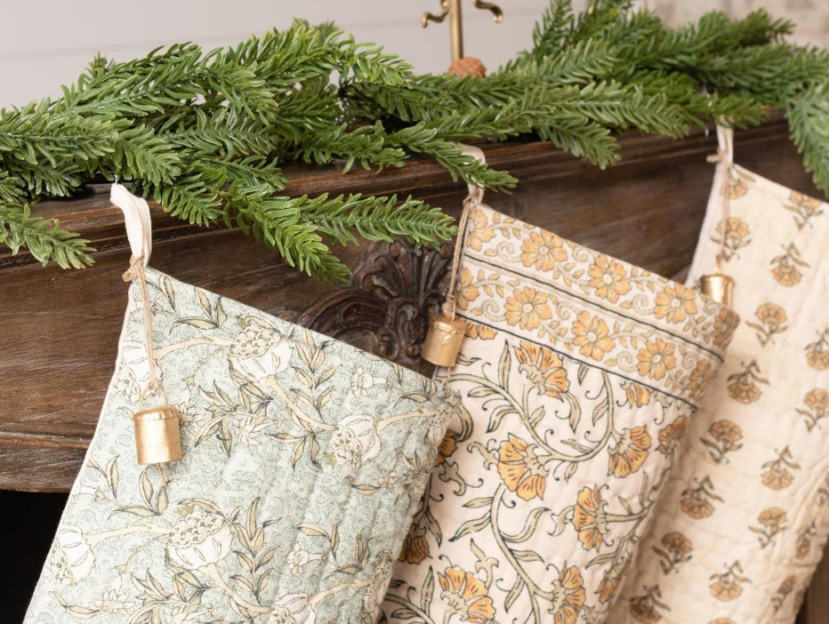 Beautiful and unique kantha stitched block print stockings. Each stocking features a single bell on the hanger. Solid cream back.