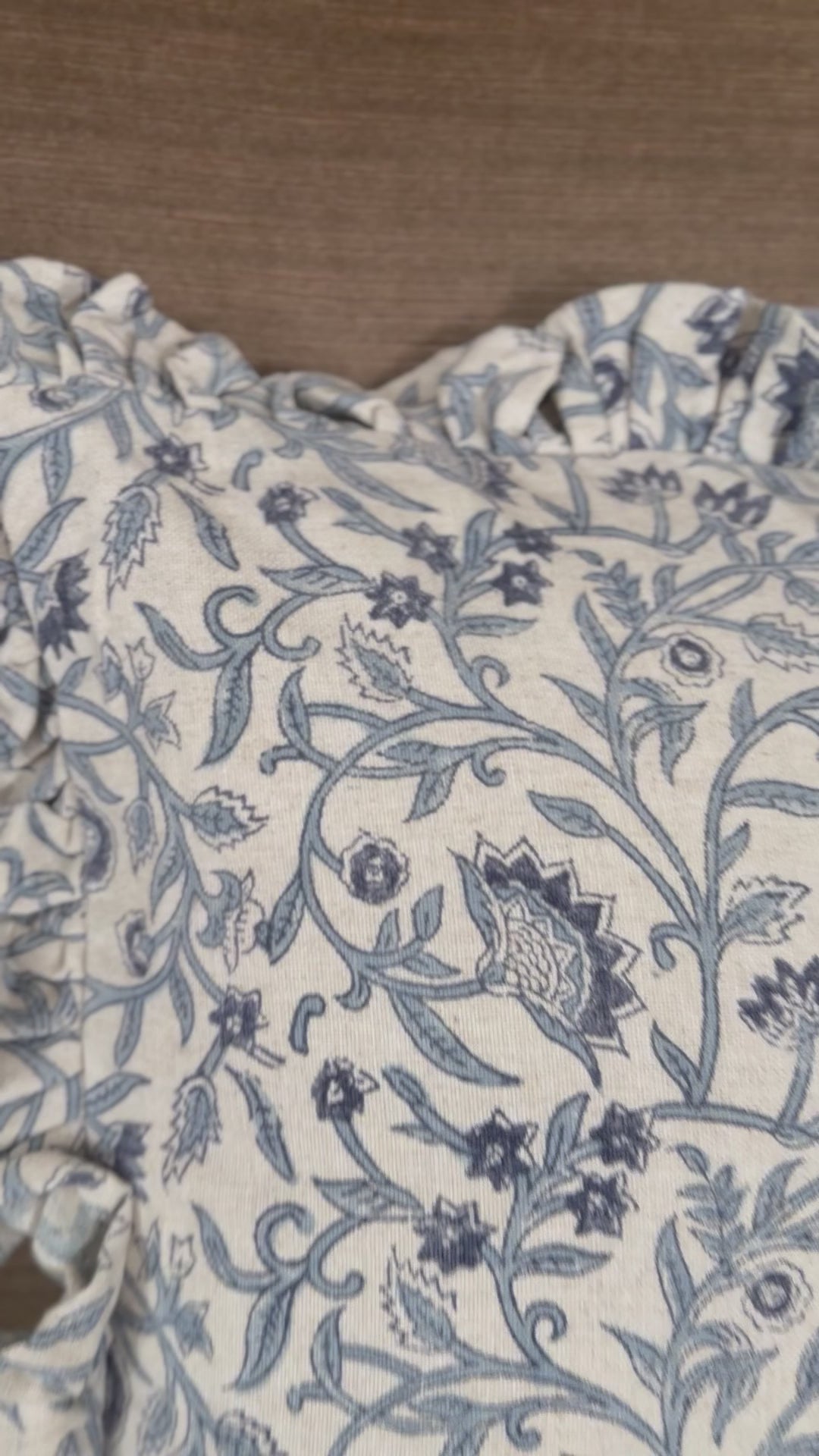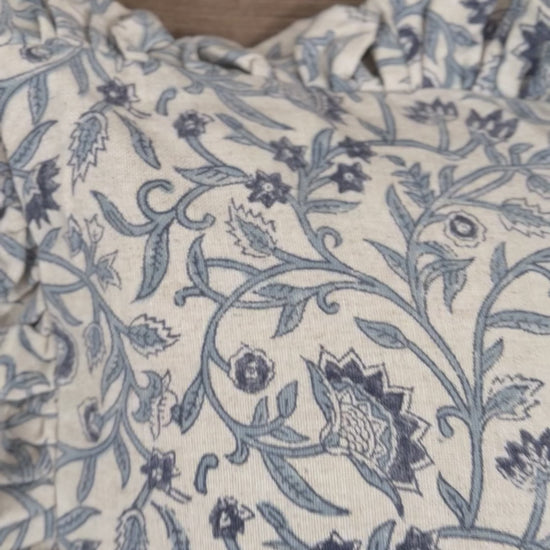 18" Square Cotton Blend Block Printed Pillow w/ Floral Pattern, Ruffled Edge & Chambray Back, Natural & Blue