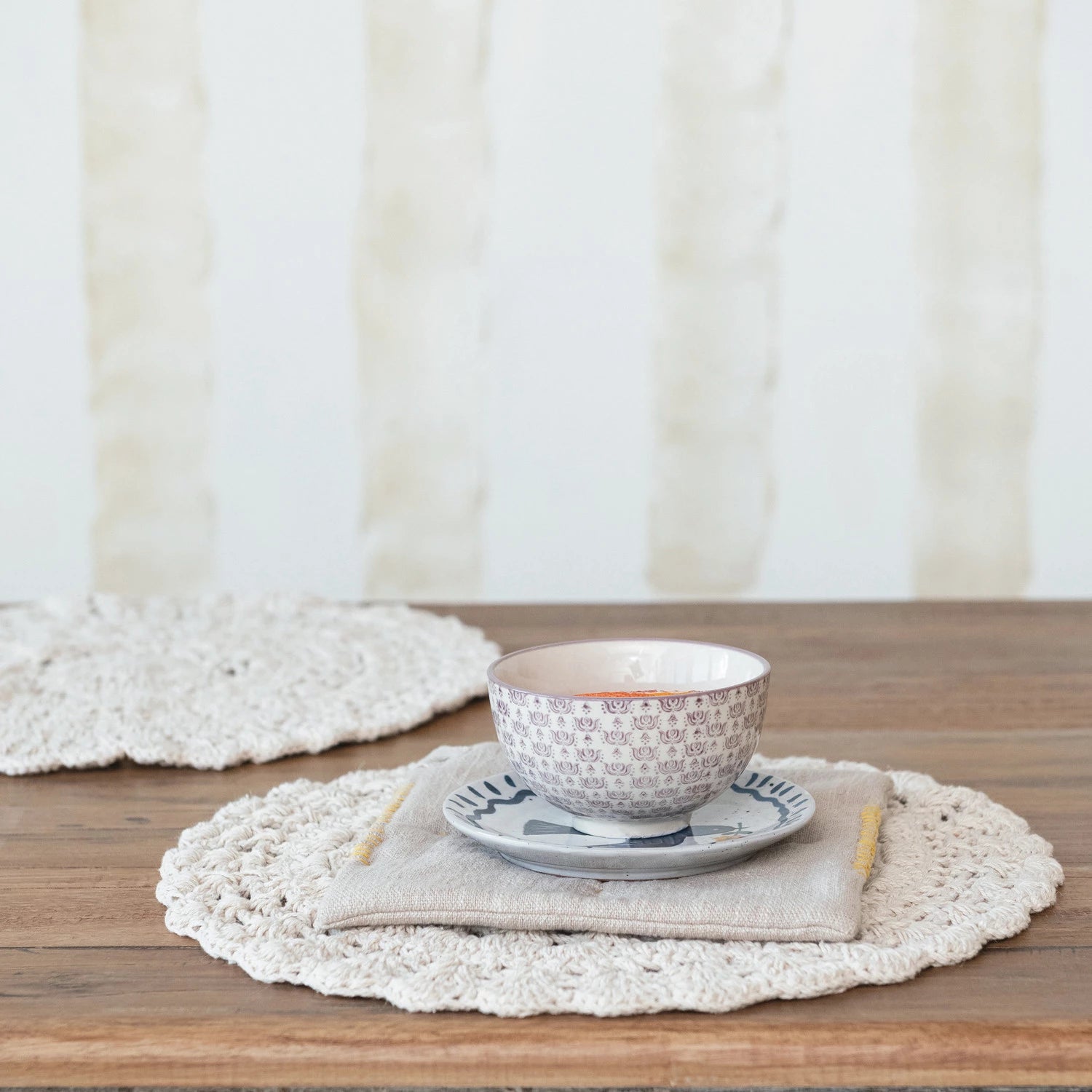 Add this Natural Cotton Blend Crocheted Round Placemat to the dining essentials and embrace the rustic yet refined aesthetic it brings to the table. Its handcrafted crochet design and natural color make it a perfect match for interiors that celebrate organic materials and textures. The round shape and ample size accommodate a variety of dishes, while the blend of cotton and polyester ensures durability and easy care. Measures 15.0 inches in diameter, providing generous space for the place settings. This placemat is not just a functional item but also an expression of timeless style that complements farmhouse, boho, and lodge themes beautifully.