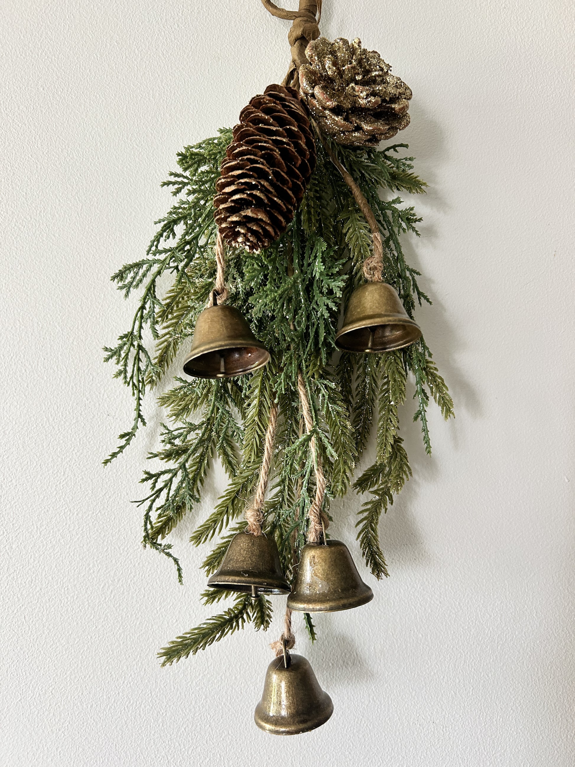 Small antique brass finished bells drape from a clutch of glittering mixed greenery and pine cones. These bells have a sweet and cheerful chime and are one of the prettiest you could ask for sound-wise. Each bell measures approx. 1.5" tall.