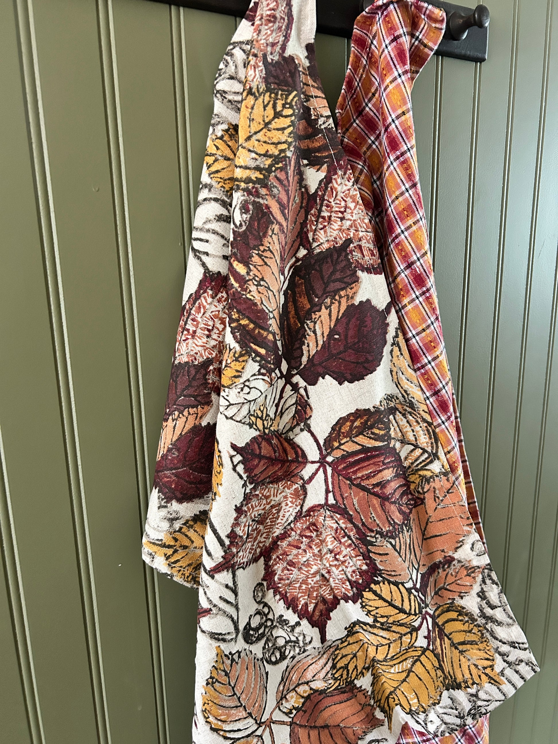 This set of two multi-harvest gathering leaves dishtowels is the perfect way to add a touch of autumnal charm to your kitchen. the dishtowels are made from a soft and durable cotton-flax blend and feature a beautiful harvest gathering leaves design. the dishtowels are also absorbent and quick-drying, making them perfect for everyday use.