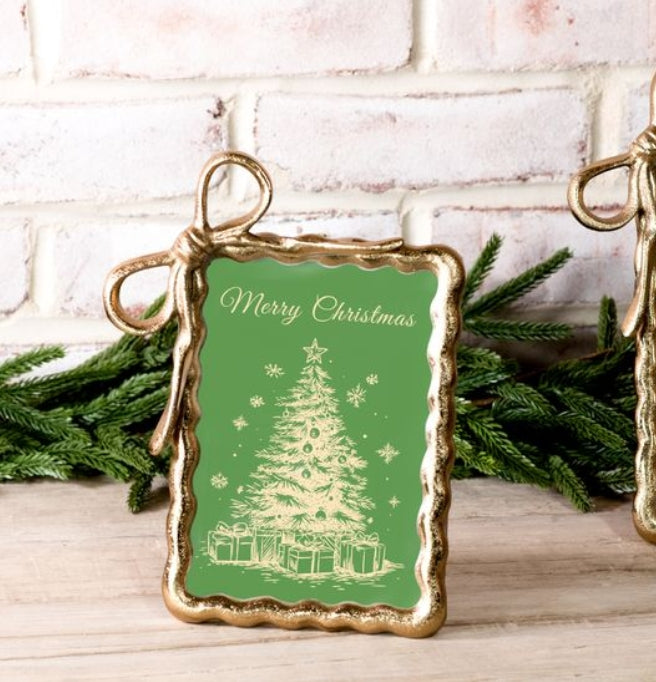 Adorable ribbon frames available in two sizes. Both come with the Merry Christmas artwork but can be used as a photo frame year round as well.