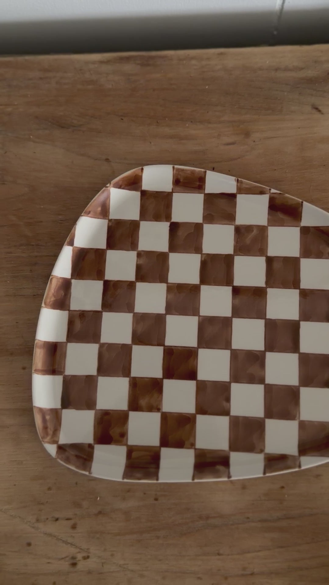 Beautiful organic shape made from stoneware with hand checkered painted pattern.