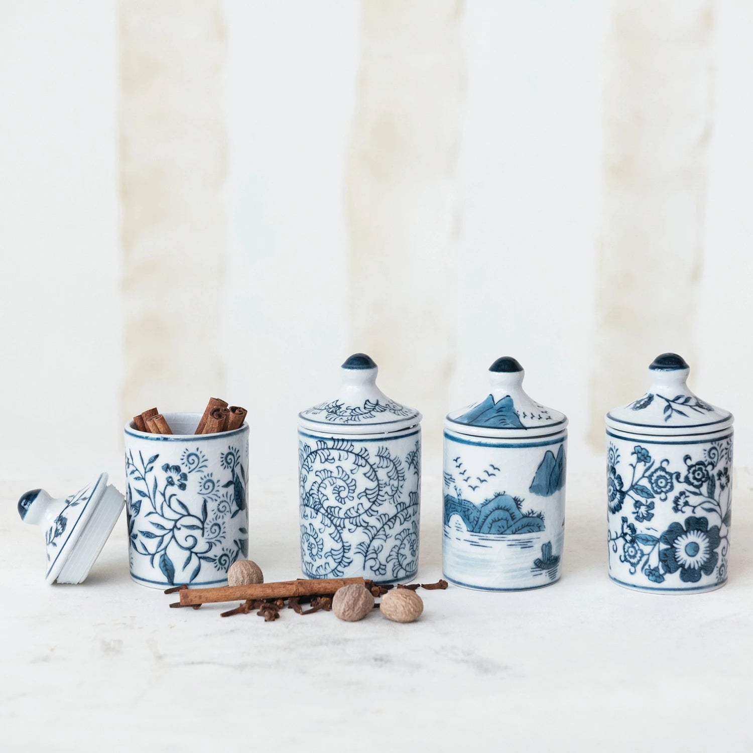 These charming mini jars feature delicate hand-painted floral patterns in blue and white. Their compact size makes them ideal for storing spices, jewelry,