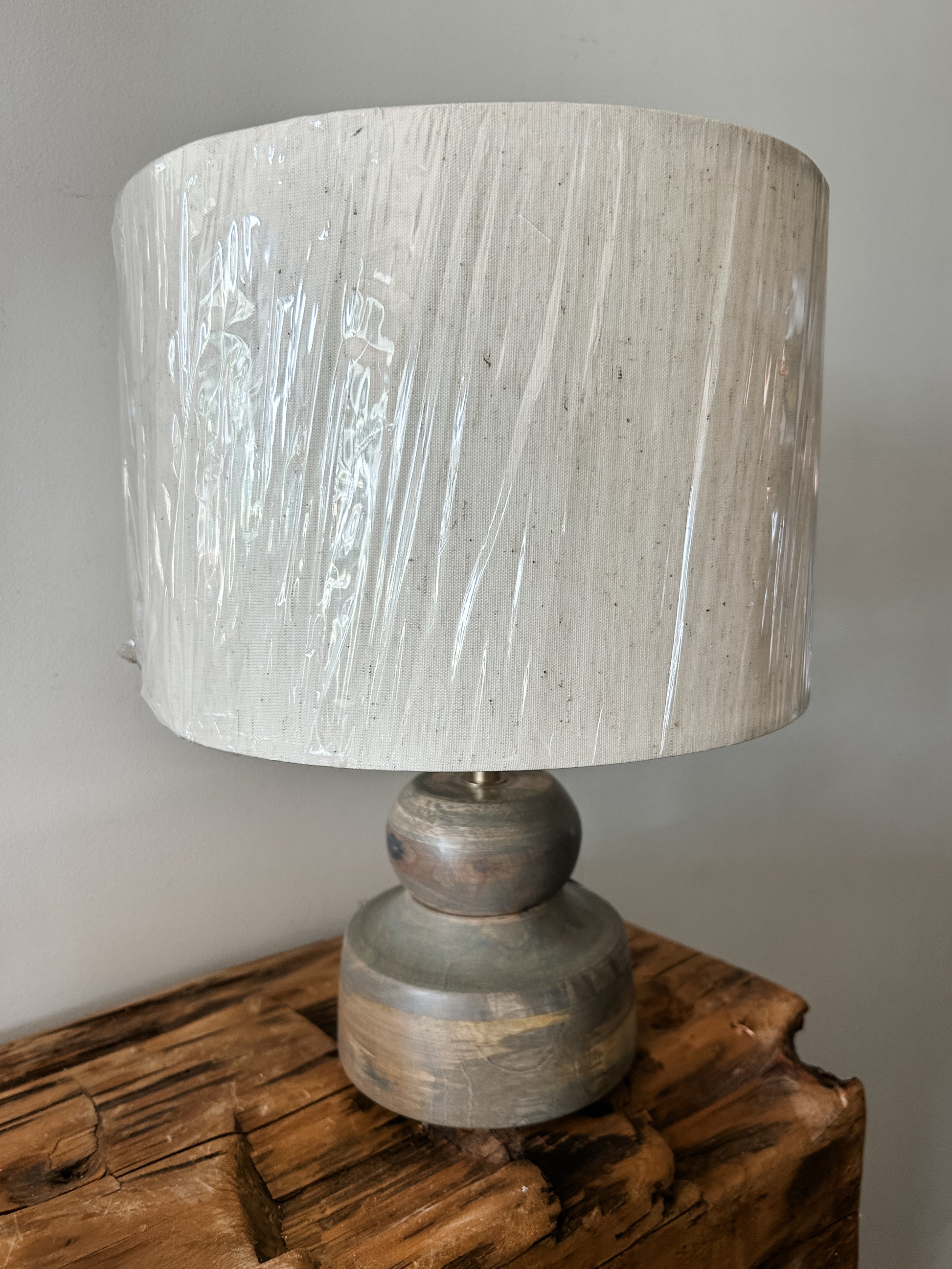 Base has a grey wash finish. Natural parts of the wood such as knots are apart of this lamps charm.