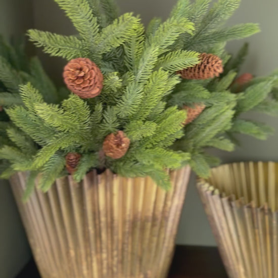 These striking oversized planters offer versatile use as either a bowl or vase. Their distinctive appeal is enhanced by an antiqued brass finish with a gracefully worn patina.