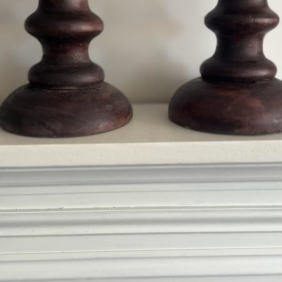 This large taper holder is expertly hand carved from mango wood and finished with a rich walnut stain. Each piece is uniquely crafted, resulting in subtle variations in design.