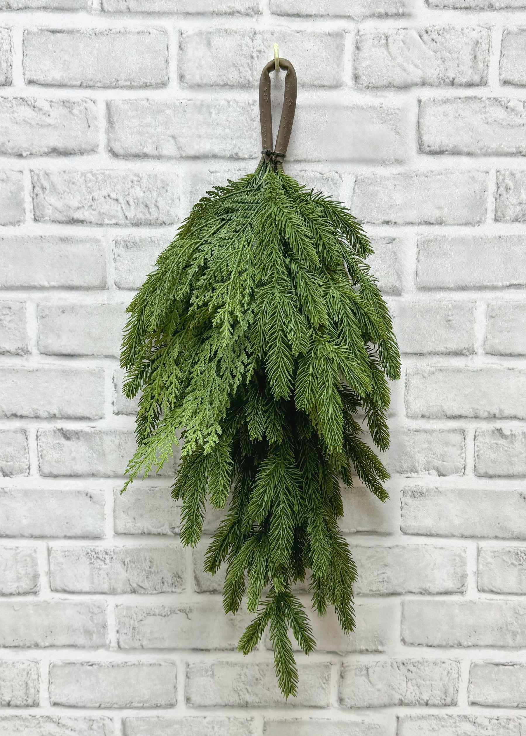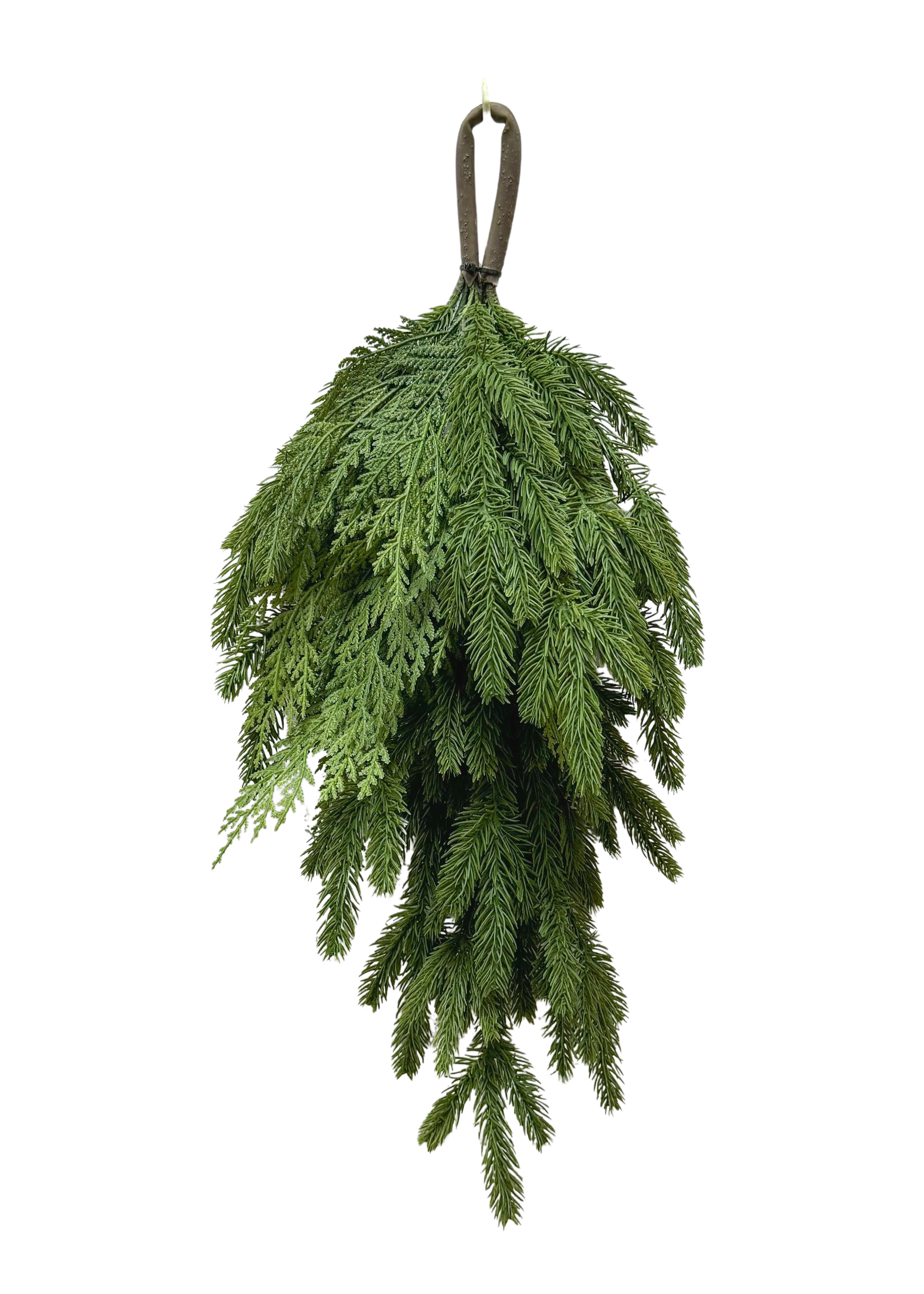 This exquisite teardrop features a blend of lifelike spruce and cedar. Ideal for decorating chair backs, windows, or doors, it pairs elegantly with bells or ribbon, which are available separately.