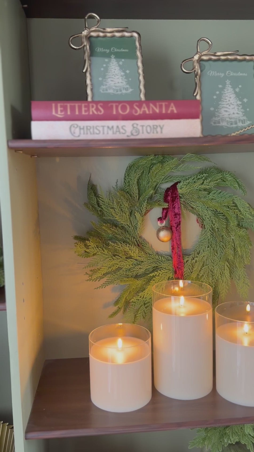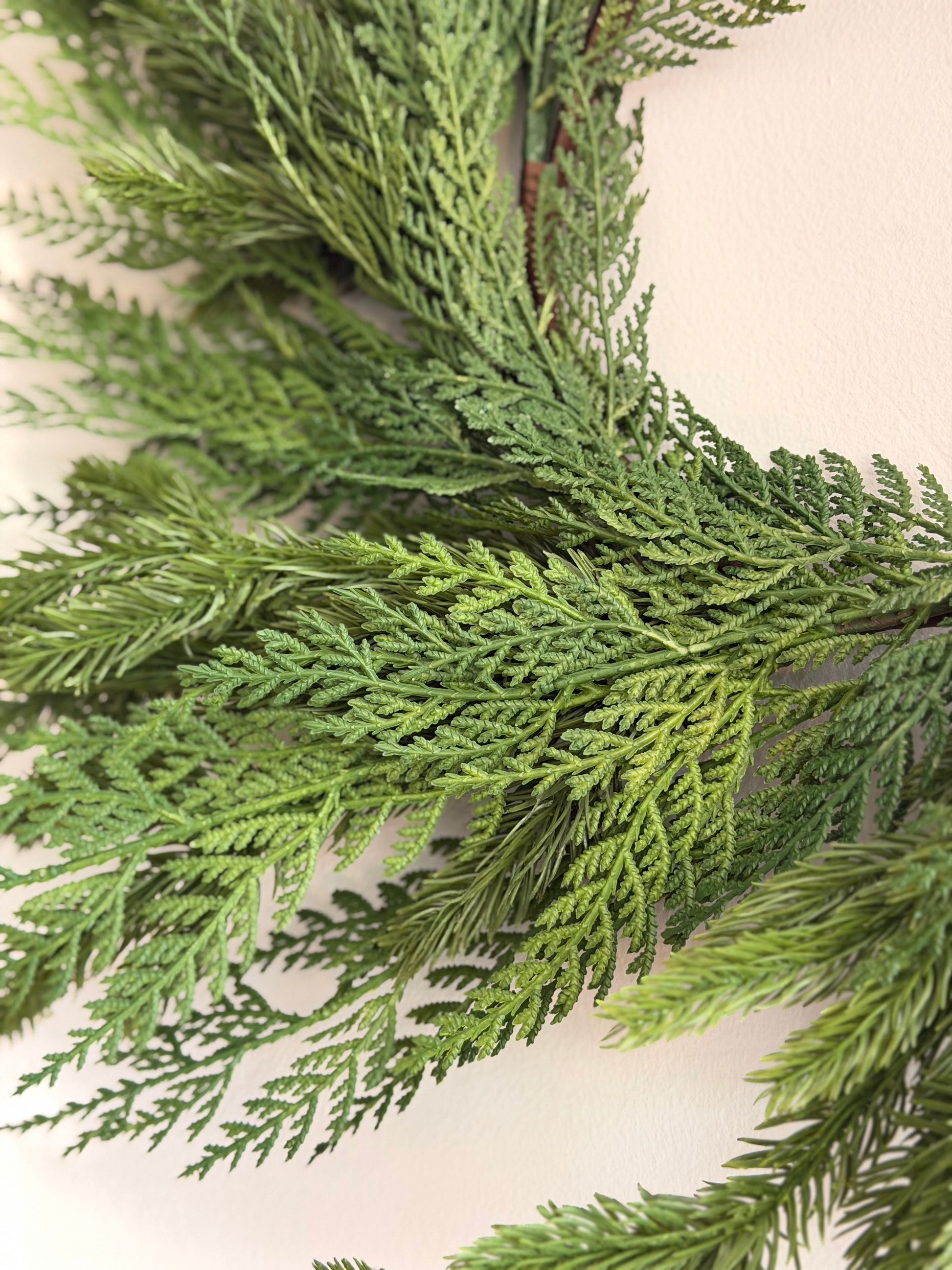 This wreath features a realistic combination of spruce and cedar foliage, ideal for decorating near candles or adorning windows throughout the winter season.