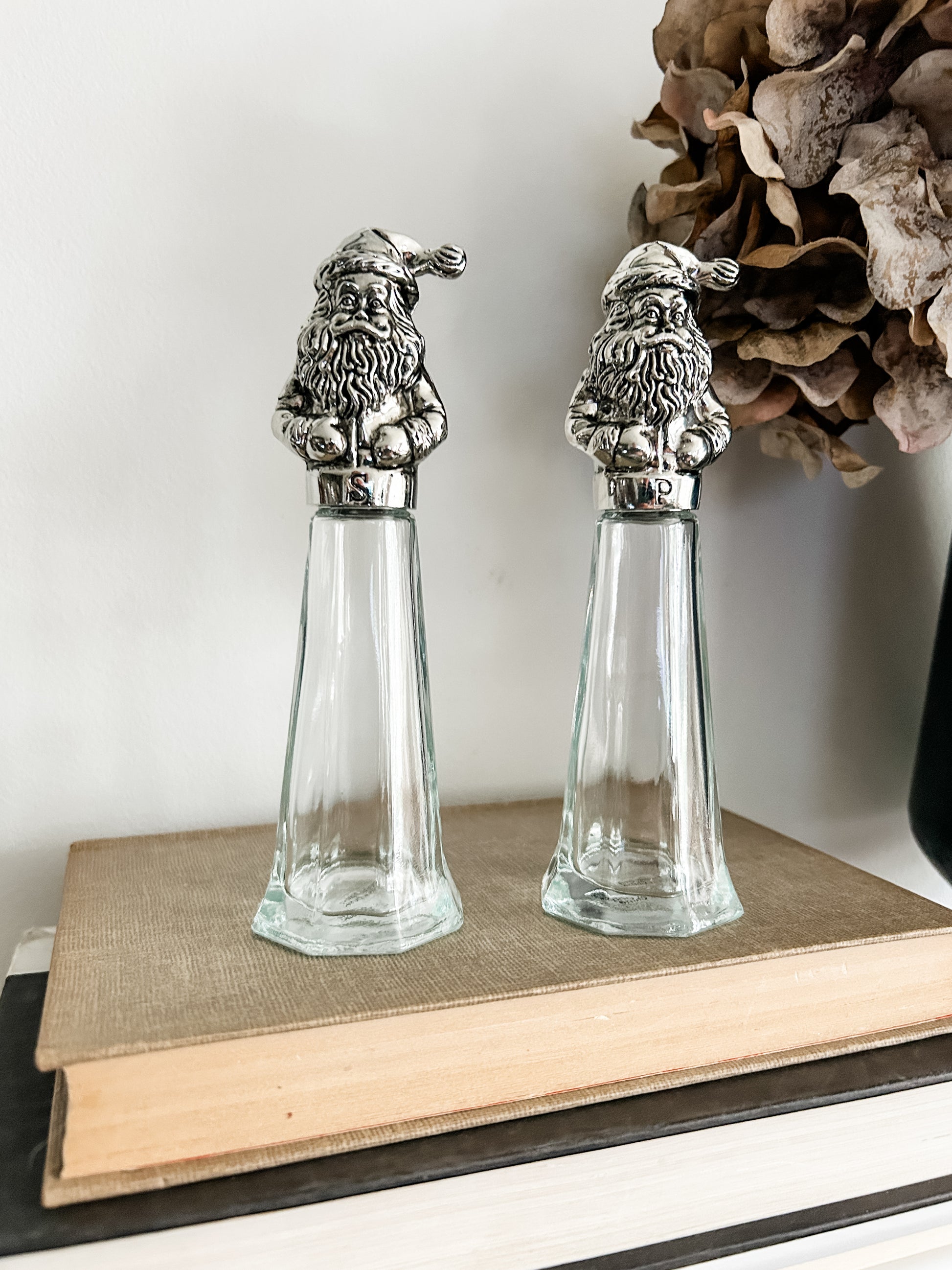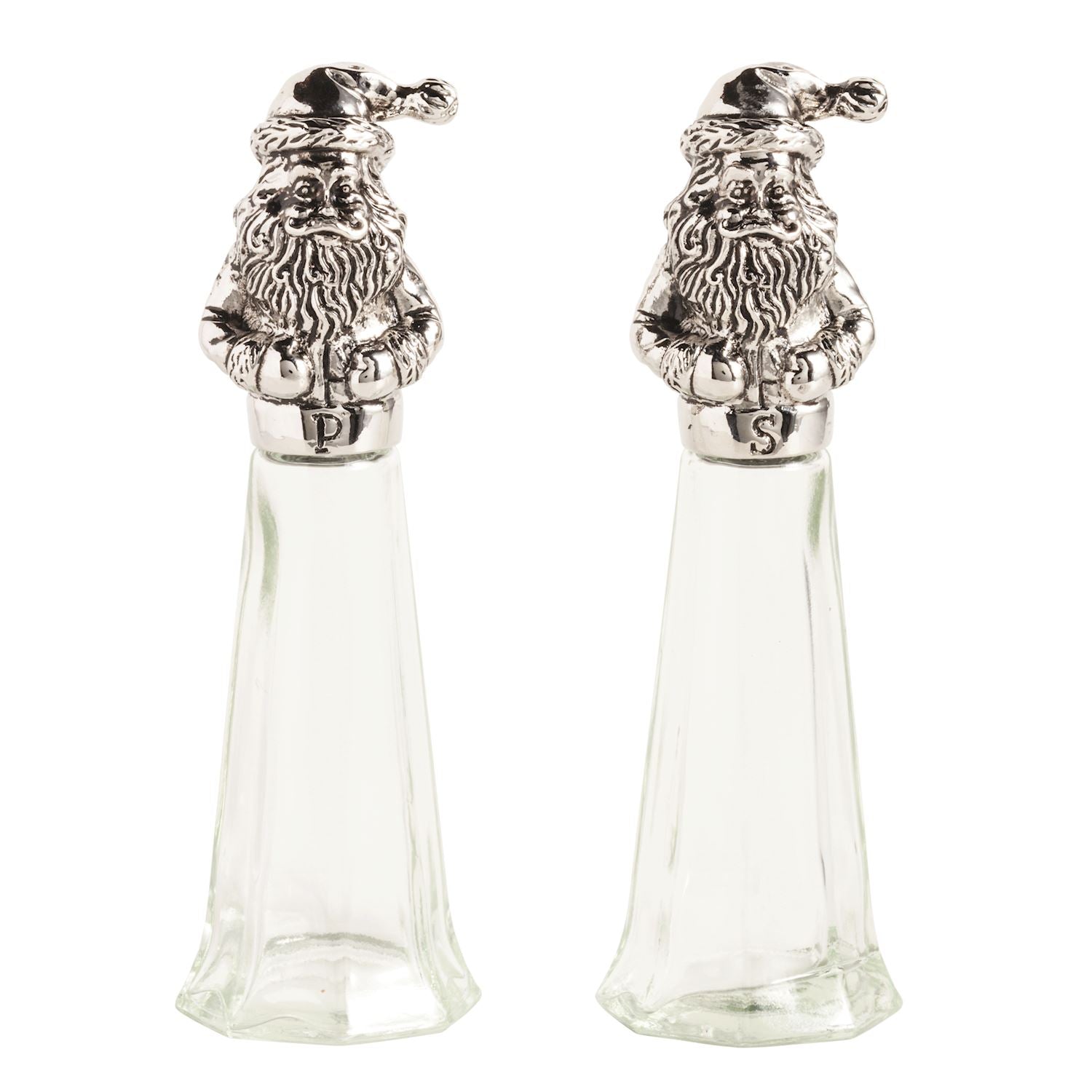 Set of two glass and cast aluminum Santa salt and pepper shakers.