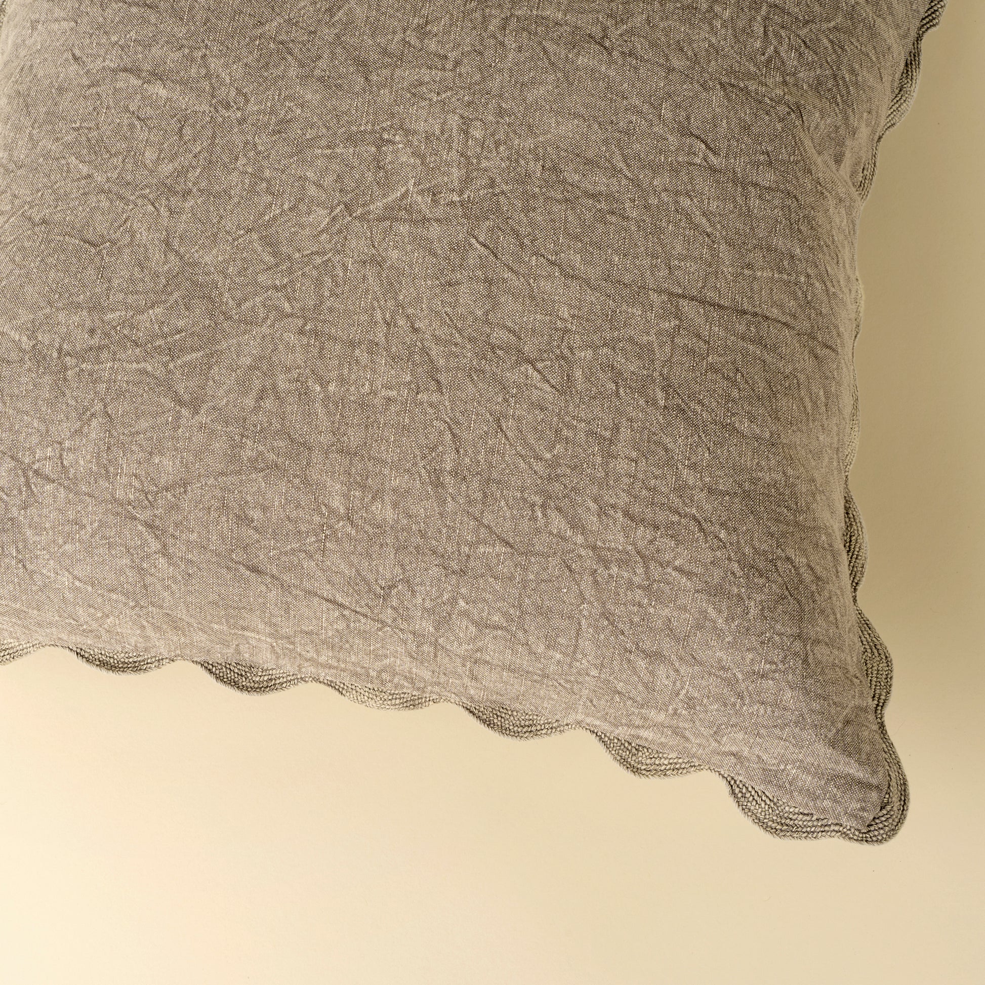 Bring subtle charm to your space with the Scalloped Edge Pillow, an artisan-crafted accent designed to elevate your decor pillows collection. Made from a stonewashed cotton-linen blend, this decorative pillow features a muted grey hue that blends beautifully with grey pillows and other neutral tones. The scalloped edge is trimmed with tone-on-tone rick rack, adding a delicate, feminine finish that feels both timeless and refined. Soft to the touch and easy to style, it’s a decorative bed pillow you’ll reach for year-round.