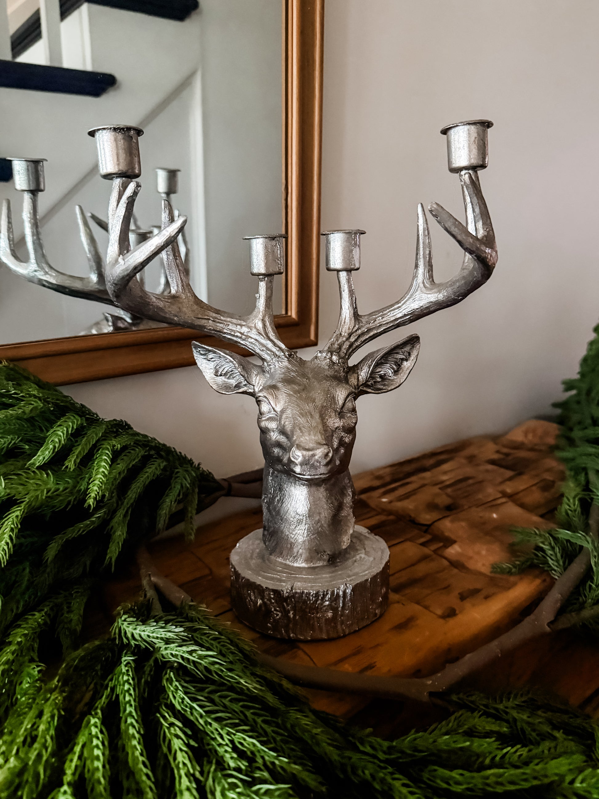 This stag head candelabra features an exclusive grey silver finish, adding a distinctive touch.