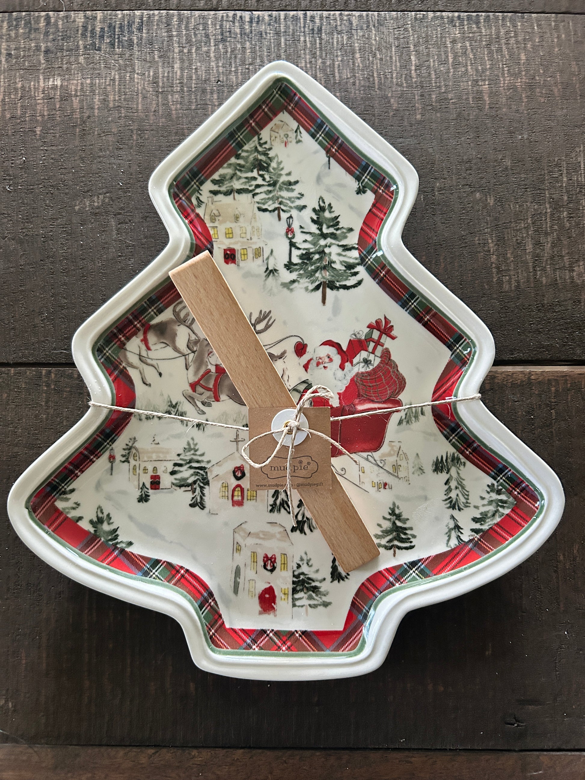 Santa Tartan Cookie Plate is a charming 2-piece set perfect for holiday gatherings. The tree-shaped cookie plate, crafted from durable stoneware, measures 12 1/2" x 10 1/2", providing ample space for your favorite festive treats. Accompanied by wooden tongs measuring 6 1/2", this set adds a touch of elegance and convenience to your holiday table. The classic tartan design featuring Santa adds a whimsical and traditional flair, making it an ideal choice for serving cookies, pastries, or appetizers during Christmas celebrations. This set is not only functional but also a delightful decorative piece that enhances the festive spirit in any home.