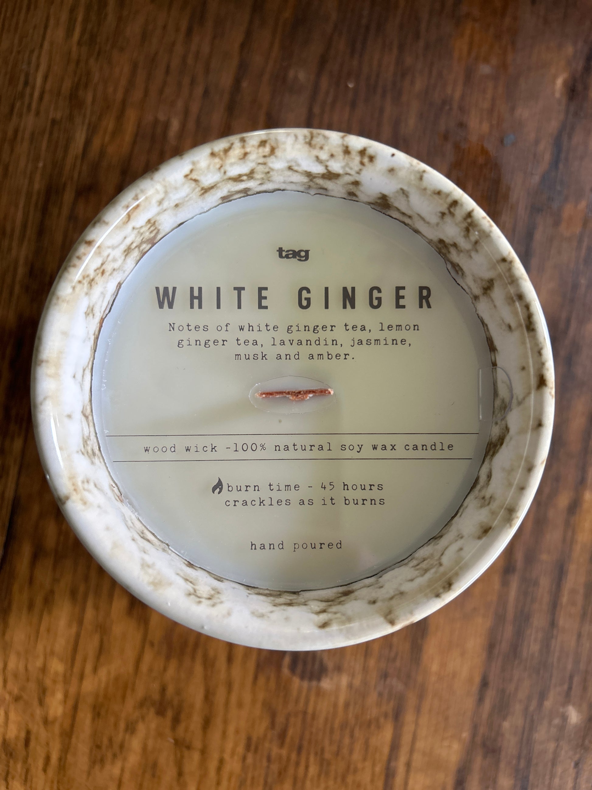 Captivating scents help create a welcoming home atmosphere, illuminating any space with a classy and cozy touch. this handpoured candle is made with 100% soy wax with wooden wick that crackles as it burns. fragrance notes of white ginger tea, lemon ginger tea, lavandin, jasmine,musk and amber. vessel features gorgeous ceramic detail.